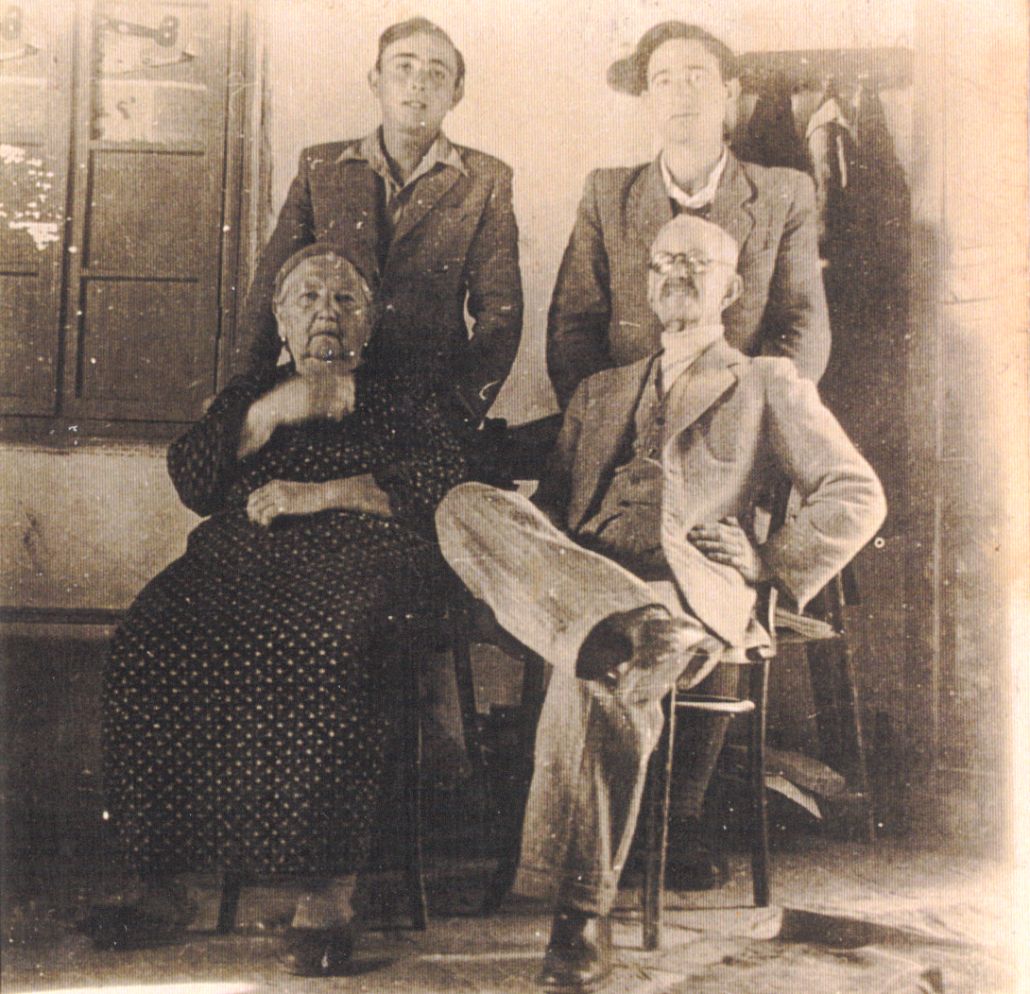 מאיר עבו ורעייתו רחל, מאחוריהם שני הנכדים יוסף עבו וזאב כהן ז
