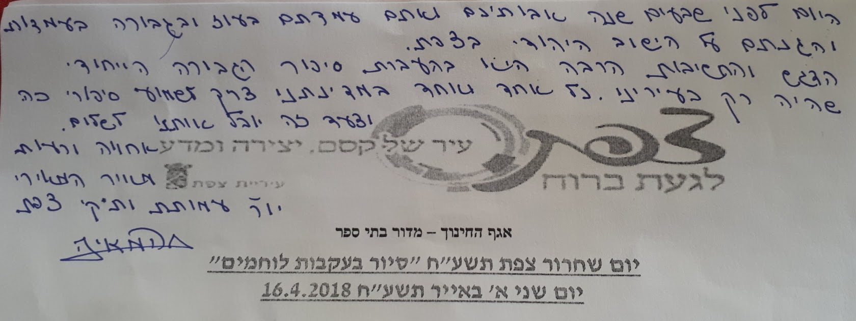 ובנימה אישית – ניכר שאגף החינוך בעיר בראשותו של מר מוטי כהן, מכיר בחשיבותו של היום הזה, נערך מבעוד מועד לקראתו ועושה כל שביכולתו להצלחתו. אני מודה לגברת חגית בוכניק על שנרתמה במלוא הכוח להצלחתו של היום ולמר מאיר המאירי, יו"ר עמותת ותיקי צפת שיזם את החיבור לבית עבו – יישר כוח!