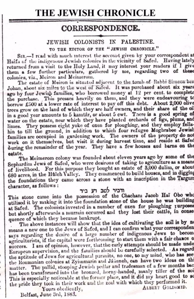 In the picture: The Jewish Chronicle for an article on the colony at Yesud HaMaalah, from the year 1883.